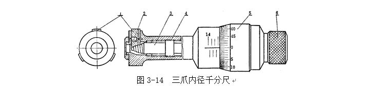 三爪內徑千分尺的工作原理,圖3-14為測量范圍11~14mm的三爪內徑千分尺,當順時針旋轉測力裝置6時,就帶動測微螺桿3旋轉,并使它沿著螺紋軸套4的螺旋線方向移動,于是測微螺桿端部的方形圓錐螺紋就推動三個測量爪1作徑向移動。扭簧2的彈力使測量爪緊緊地貼合在方形圓錐螺紋上,并隨著測微螺桿的進退而伸縮。
