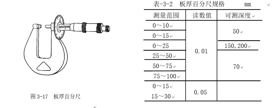 板厚百分尺如圖3-17所示。主要適用于測量板料的厚度尺寸。其規格見表3-2。