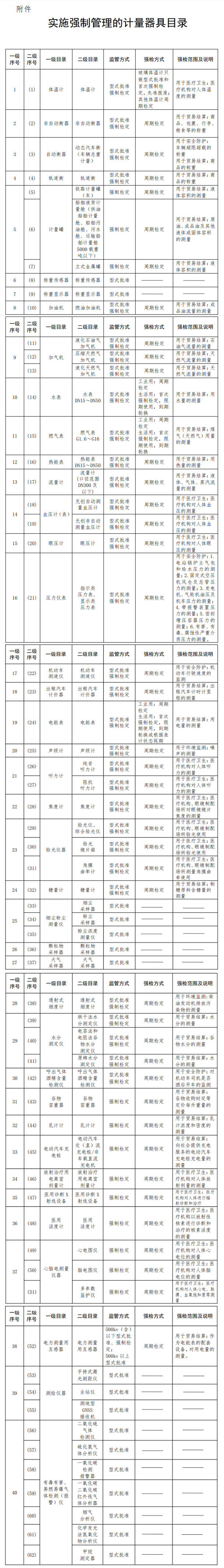 根據(jù)文件,在此次《目錄》中,一級序號有40個,二級序號有62個,其中一級目錄中所列設(shè)備包括:體溫計、非自動衡器、自動衡器、稱重傳感器、流量計、機動車 測速儀、聲級計、水分測定儀、透射式煙度計、有毒有害、 易燃易爆氣 體檢測(報 警)儀等。