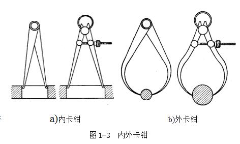 圖1-3是常見的兩種內外卡鉗。內外卡鉗是最簡單的比較量具。外卡鉗是用來測量外徑和平面的,內卡鉗是用來測量內徑和凹槽的。它們本身都不能直接讀出測量結果,而是把測量得的長度尺寸 (直徑也屬于長度尺寸),在鋼直尺上進行讀數,或在鋼直尺上先取下所需尺寸,再去檢驗零件的直徑是否符合。