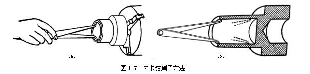 用內(nèi)卡鉗測量內(nèi)徑時,應(yīng)使兩個鉗腳的測量面的聯(lián)線正好垂直相交于內(nèi)孔的軸線,即鉗腳的兩個測量面應(yīng)是內(nèi)孔直徑的兩端點。因此,測量時應(yīng)將下面的鉗腳的測量面停在孔壁上作為支點(圖1-7a),上面的鉗腳由孔口略往里面一些逐漸向外試探,并沿孔壁圓周方向擺動,當(dāng)沿孔壁圓周方向能擺動的距離為最小時,則表示內(nèi)卡鉗腳的兩個測量面已處于內(nèi)孔直徑的兩端點了。再將卡鉗由外至里慢慢移動,可檢驗孔的圓度公差,圖1-7b 所示。