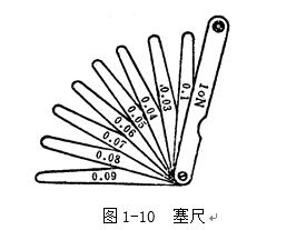 塞尺又稱厚薄規或間隙片。主要用來檢驗機床特別緊固面和緊固面、活塞與氣缸、活塞環槽和活塞環、十字頭滑板和導板、進排氣閥頂端和搖臂、齒輪嚙合間隙等兩個結合面之間的間隙大小。塞尺是由許多層厚薄不一的薄鋼片組成(圖1-10)按照塞尺的組別制成一把一把的塞尺,每把塞尺中的每片具有兩個平行的測量平面,且都有厚度標記,以供組合使用。