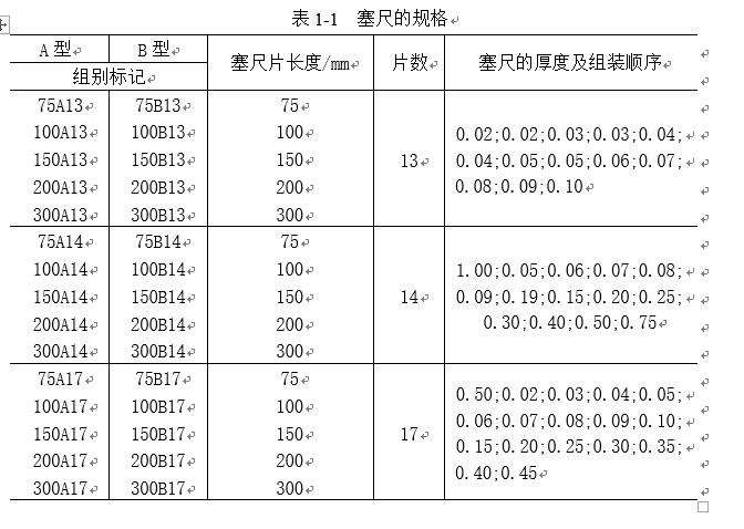 測量時,根據結合面間隙的大小,用一片或數片重迭在一起塞進間隙內。例如用0.03mm的一片能插入間隙,而0.04mm的一片不能插入間隙,這說明間隙在0.03~0.04mm之間,所以塞尺也是一種界限量規。塞尺的規格見表1-1。