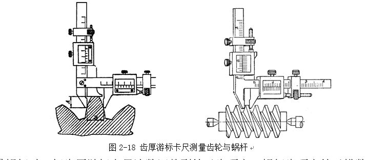 齒厚游標卡尺(圖2-18)是用來測量齒輪(或蝸桿)的弦齒厚和弦齒頂。這種游標卡尺由兩互相垂直的主尺組成,因此它就有兩個游標。A的尺寸由垂直主尺上的游標調